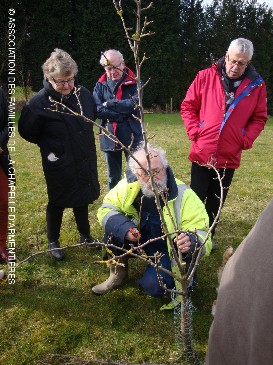 Ce samedi matin, temps frais mais sec, une douzaine d'amateurs de jardins se sont présentés sur le lieu de rendez-vous : le jardin de Ghislaine Ramery. Un professeur du Lycée Horticole de Lomme, Monsieur BICHON, est venu sur place, pour donner des indications sur la taille des arbres fruitiers, renseignements précieux qu'il a mis en pratique devant des jardiniers très intéressés
