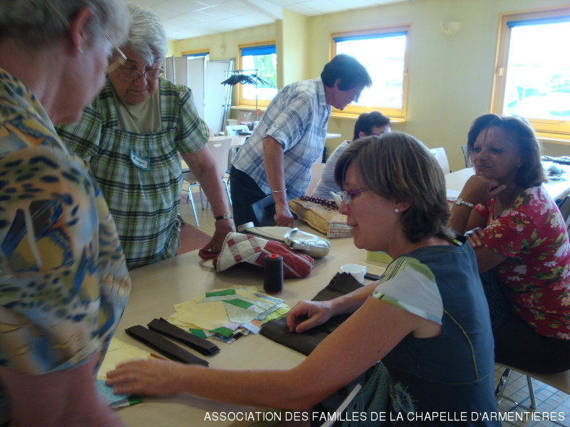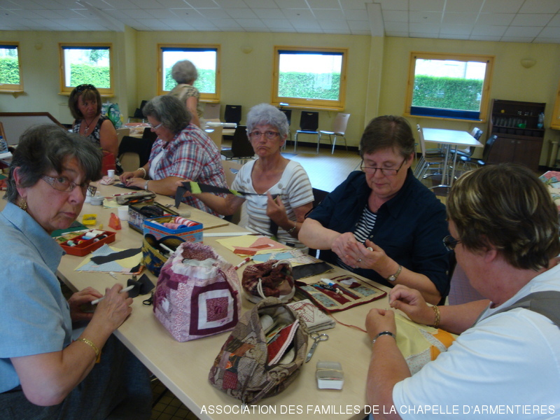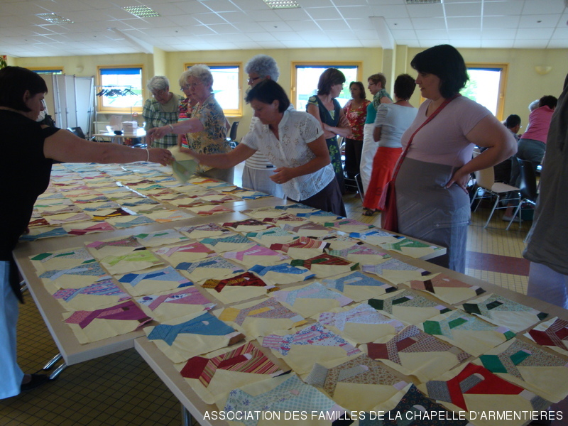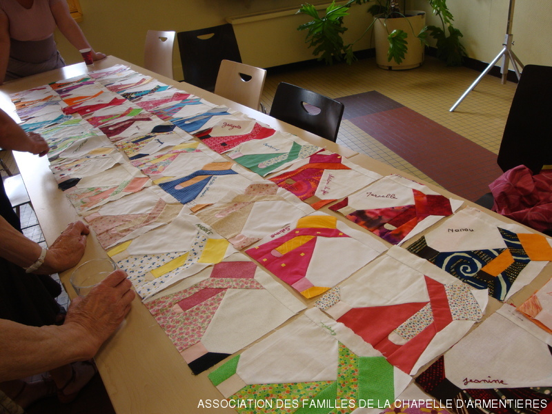 un modèle de carré proposé par l'Atelier de Nieppe a été réalisé dans chaque groupe et 150 carrés ont été réunis puis partagés afin de permettre la réalisation par chaque groupe d'un patchwork assemblé à sa façon.