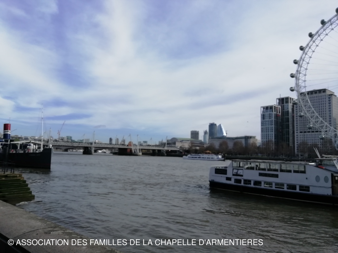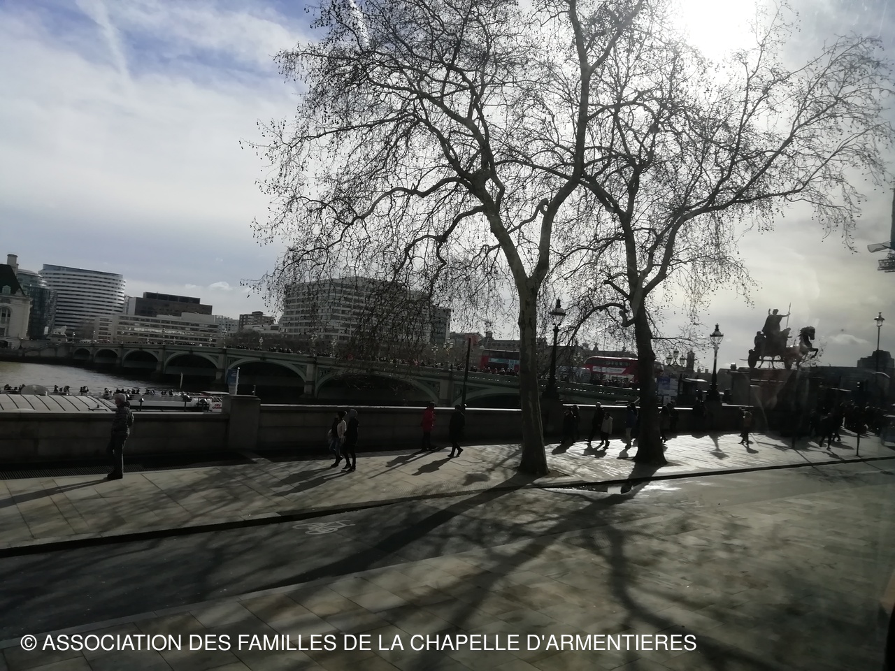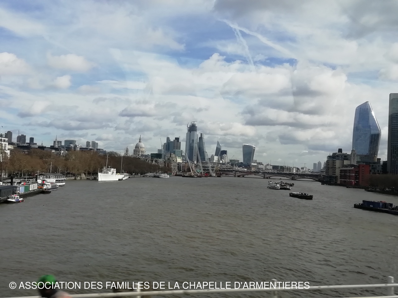 alors que nous avions quitté la France sous la pluie et le vent, à la sortie du tunnel, plus de vent et le ciel nuageux nous laissait voir du ciel bleu... le temps d'arriver sur Londres, le soleil était là et  ne nous a plus quittés...